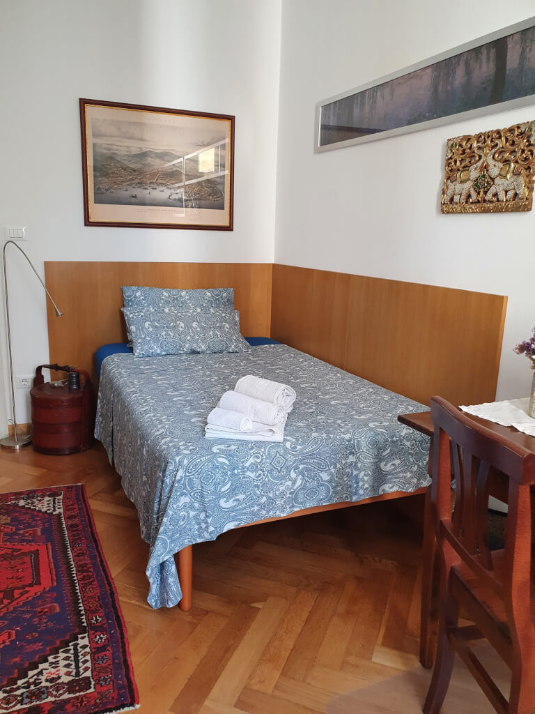 The single room furnished with a queen size bed is available from january. Wardrobe. Desk and bookcase.