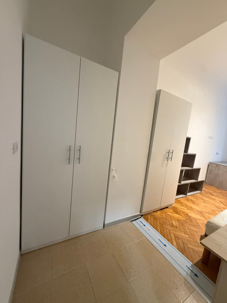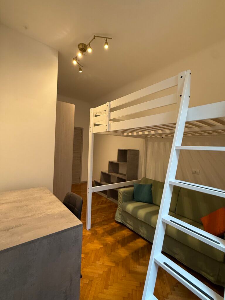 New furniture: large bed with the option of a loft, 4-door wardrobe, armchair/sofa, bookcase, large desk.