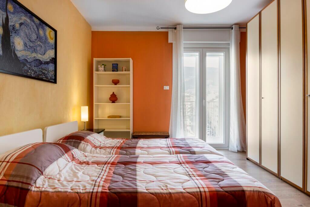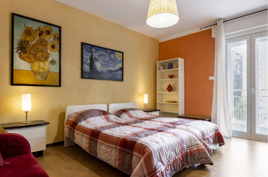 It consists of a large bedroom with two single beds, a bathroom, a kitchen, a hallway, and a