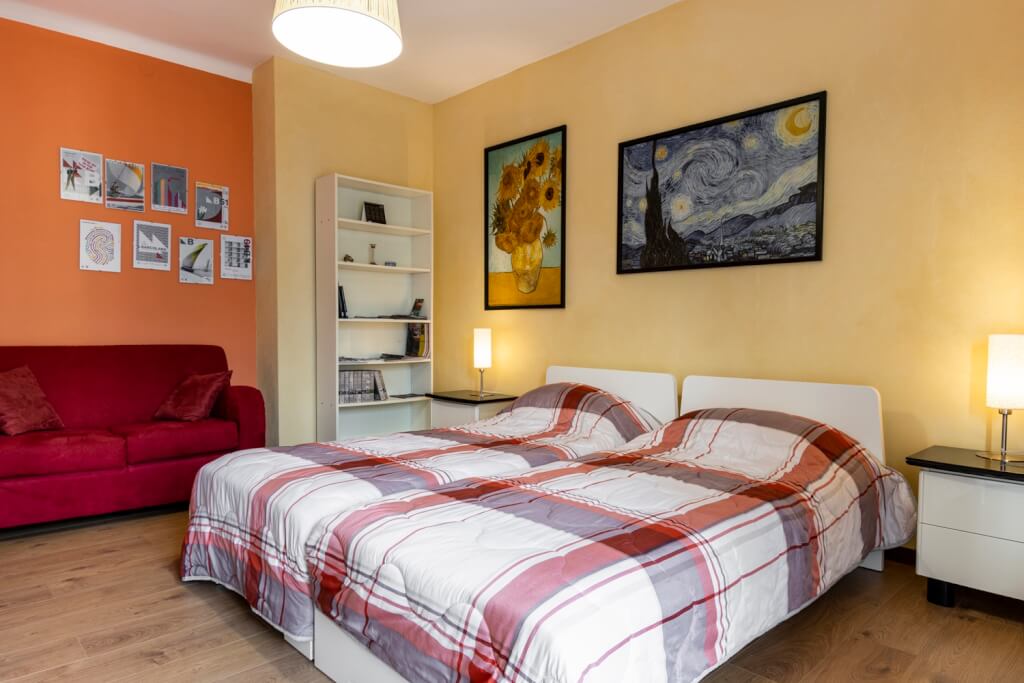 It consists of a large bedroom with two single beds, a bathroom, a kitchen, a hallway, and a